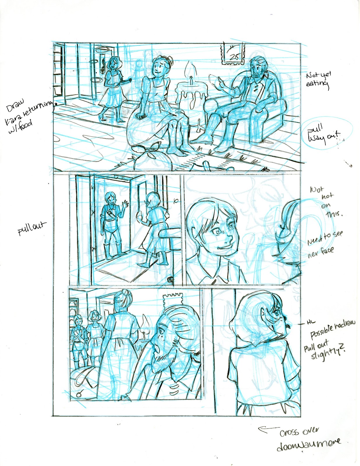 I don't usually do this, but since this is my baby-love-darling project, I thought I'd share the first chapter of roughs with you guys, WITHOUT corrections and WITH notations. If you see any glaring errors, please let me know, as the only page that's been blue-lined so far is the cover. Notations made in black ink were carried over from my thumbnails, and already corrected, whereas non photo blue or graphite corrections still need to occur.