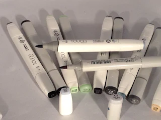I first saw ShinHan Twin Touch markers at this year's New York Comic Con, although I haven't had an opportunity to check them out until recently. The fact that they looked so similar to Copic Sketch markers caught my eye, and I wondered if they could possibly hold a candle to Copic Sketch markers' super flexible brush tip.