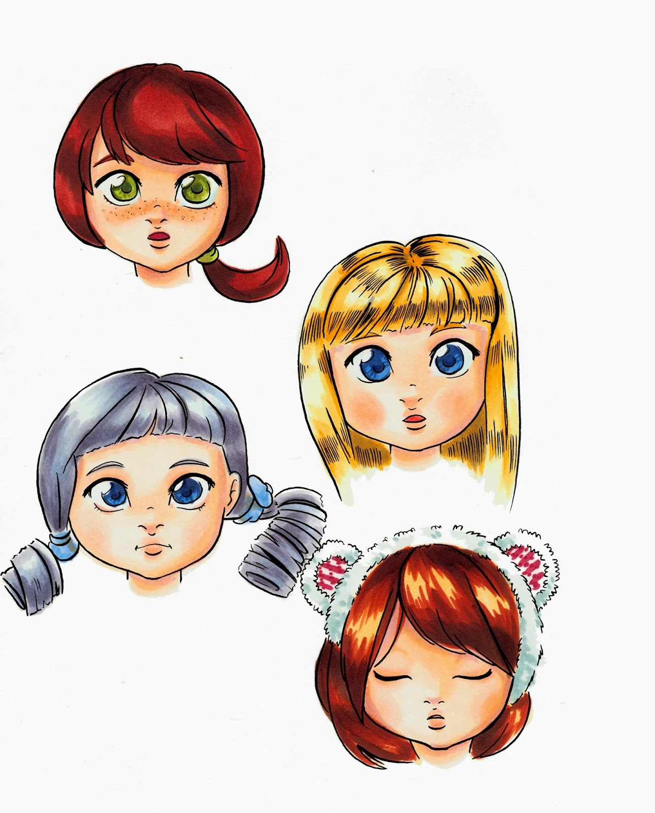I did a little likeness exercise using my collection of Jun Planning's Ai Dolls as reference. Many of these dolls share the same face mould, so I tried to change minor things to give them more distinct faces without departing too far from the reference. The sketch and inks were in my sketchbook, and I taped a sheet of translucent Copic PM Pad to do the Copic rendering. It holds ink better than tracing paper, but you'll quickly lose your lines of the colors you apply are too dark.