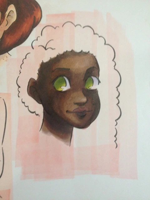 I'm still trying to develope methods and techniques to better render darker skintones using alcohol based markers. Part of the issue is that it seems like the colors are never really right for what I want to do, and part of it is with darker skintones, you really can't fudge things the way you can with lighter ones. I also had trouble getting my darkest colors to appear as dark and vibrant as they actually are, so there isn't as much contrast between Naomi's skin and hair as I normally like.