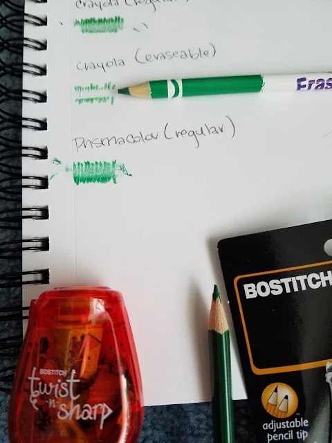 Mom discovered these Crayola Erasable color pencils while we were browsing the color pencil area of the school supply section. I thought they were intriguing- as a really little kid, I would sometimes outline or 'ink' with a black color pencil, and mistakes could not be easily erased. I could definitely see the value of erasable color pencils, and wanted to give them a shot.