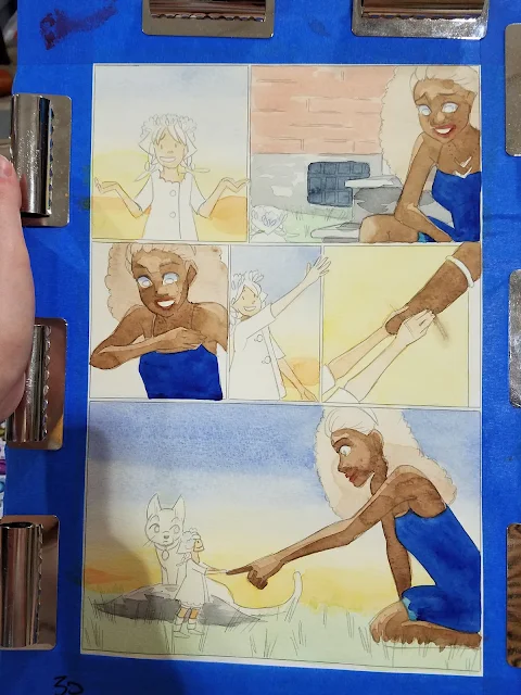 As you create pages and complete studies, you'll find out which techniques are your mainstays, and which techniques will on work on certain papers. There are many wet into wet techniques that work well on handmade cotton papers and higher quality mould made papers that are impossible to execute well on Montval cellulose paper, so I cannot use those techniques in my comics. There are techniques that work on cold press papers that will not work on hot press.
