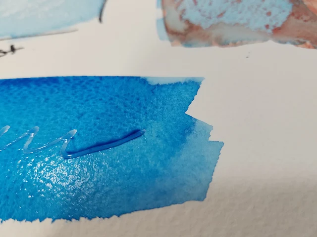 As demonstrated, once the masking fluid is removed, it leaves a mark of white paper against blue paint.