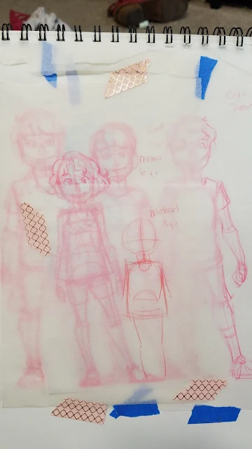 She was sketched directly in my sketchbook, and when designing other characters, I tape the tracing paper on top.