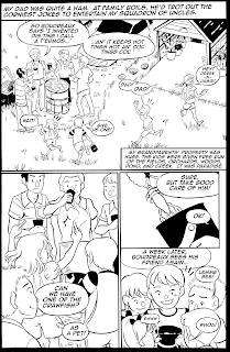 Once my thumbnails are completed, I scan them, do any rough corrections or revisions, and break them into individual comic pages. These are scaled up to 6"x9", converted to bluelines, and printed on copier paper, one comic page per sheet.